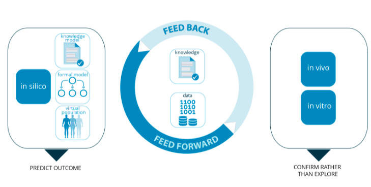 Due to its nature, an in silico approach allows testing a large number and range of hypotheses in a rather limited length of time. However, this does not imply that in vitro and in vivo studies should be replaced. The well-controlled, adequately powered randomised clinical trial is and will continue to be the gold standard for showing safety and efficacy for a given treatment, regimen, and target population. But the cost, time, and other factors make the clinical trial an exceptionally inefficient tool for decisions with a broad scope (e.g. target selection, lead optimization), or where there are difficult combinatorics (combination therapies, multiple patient profiles). The in silico results can inform and improve in vitro and in vivo trials in these and other cases. For instance, the odds of estimating the optimal dose-effect relationship a priori using the traditional approach of running several dose-escalation studies are rather slim. This should result in a self-reinforcing crosstalk where hypotheses are first tested in silico. In vitro and in vivo studies in turn generate new data and knowledge which help to improve the disease and treatment models and the associated VP. This engages a virtuous circle which incorporates the in silico approach in support of traditional approaches (Figure 1). Thus, the paradigm shift here is that the “traditional” studies will become confirmatory of in silico trials, rather than remain exploratory as they are today. In this regard, in silico clinical trials have the potential to change the R&D paradigm.