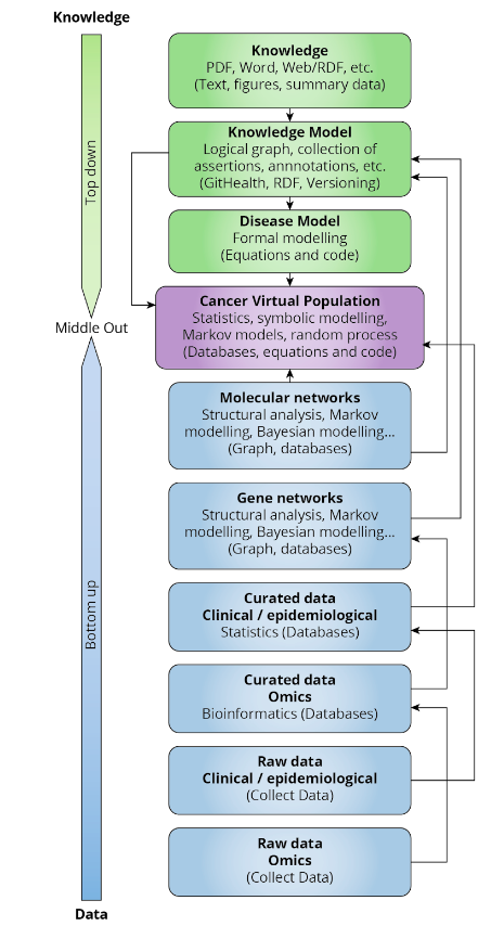 Much hype has surrounded the emergence of big and smart data analytics applications in biomedicine over the past years [2]. Unfortunately, data-centric approaches are bound to fail for a number of inescapable limitations, which are either practical or inherent to the nature of data. Omics on their own are weak predictors of clinical outcomes. Living systems are not built from a limited number of standard parts, with interactions encoded in the genome[3]. Furthermore, the majority of databases with omics investigations are obtained in an observational context. Genome-Wide Association studies (GWAS) for example, which have identified multiple genetic variations that contribute to common, complex diseases, are case-control studies by design. Thus, the explanatory link between patients’ treatment(s), outcomes and omics findings are derived from correlations. Correlations do not necessarily imply causation, and this is why the randomized controlled study with a priori protocols and randomisation reducing bias and confounding is still considered the gold standard to demonstrate a causal link between the intervention and the observed outcome. No statistical modelling or propensity score can render patients with different treatments fully comparable at baseline. The situation is even more confounded when a sequence of treatments has been applied, personalised to each study participant. With the exception of genomics data, the within-patient (or between observational settings) finding variability is poorly understood. The dynamics of, e.g. protein expression, need further exploration. Cross-sectional data do not inform these dynamics and sequential data inform dynamics poorly because the path of data collection cannot be harmonized with the timescale of the phenomenon of interest. A snapshot cannot capture behaviour. Another issue relates to the lack of standardization. Even the most common surrogate markers (e.g. progression-free survival (PFS) and pathology grading and staging) tend to lack sufficient robustness to predict overall survival accurately. Furthermore, even with large databases, meaningful rare events or rare variants may be missed because of insufficient statistical power. More importantly, validity of results depends on the data and the time and settings in which they were obtained, which limits generalizability to prospective patients as well as patients treated in different settings. These are limitations difficult to overcome, even with sophisticated machine learning approaches. Data-driven algorithms can only be tasked with making “inductive” predictions based on past data. The key resides in exploiting these increasingly large datasets in combination with the trove of knowledge available in the scientific literature.