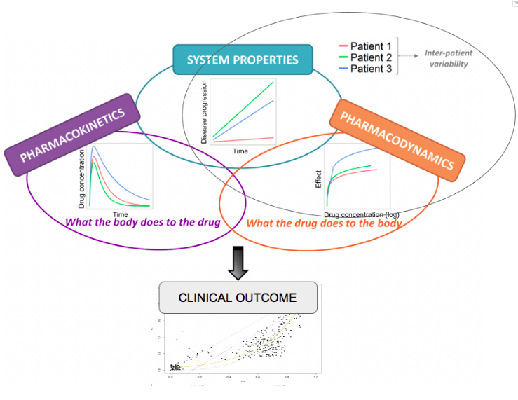 - Pharmacokinetics (PK): “What the body does to the drug”, i.e. journey of the drug molecule from the intake site (mouth, skin, …) to either its site(s) of action or elimination (chemical transformation or excretion unchanged).