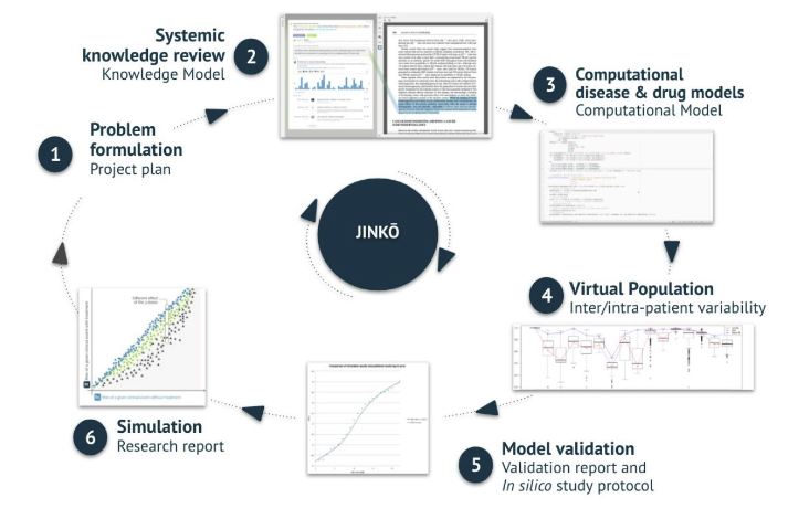 In order to help in operating the six steps and the demand of transparency and continuous model updating NOVA has developed JINKŌ - unified M&S or in silico clinical trial simulation platform.