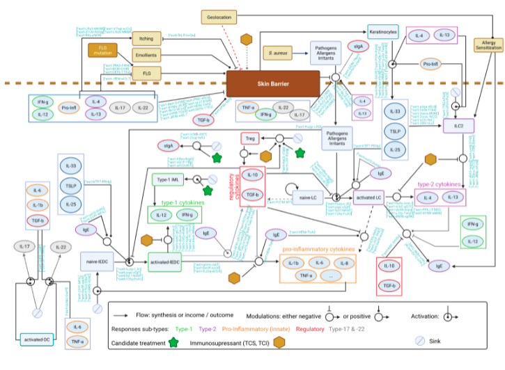 - Systemic knowledge review. All knowledge within the above defined perimeter that can be extracted from scientific literature is considered for inclusion and curation. The major issue addressed by a piece of knowledge curation is its strength of evidence. The piece of knowledge is then rewritten as an assertion (one, two or more biologics associated with or connected by a function). Two issues at this step that determine the relevance of the whole M&S process: 1) the scope of the review should be larger than necessary to prevent missing relevant pieces of knowledge, even if it means that the computational model may be reduced later (for instance after the sensitivity analysis); 2) normal physiology and biology must be integrated into the model before introducing pathophysiology. This step is particularly sensitive and often the most time consuming. It leads to the Knowledge Model (KM), a mixture of figures and text, arrangement of assertions in structured order (see Box 5 and Figures 4 and 5)