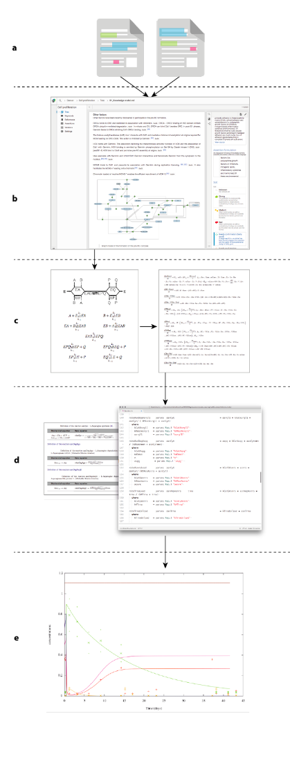 a Scientific articles on the biological system to be modelled are identified and analysed. To apply the process detailed in Box 4, all known and relevant processes from genes to clinical events need to be accounted for, covering both the physiology and the pathology. Relevant knowledge pieces are extracted, curated, annotated and translated in assertion, function(s) linking biological entities (e.g. “IkB kinase phosphorylates IkB, resulting in a dissociation of NF-kappaB from the complex with its inhibitor”). The curation and annotation process includes the assessment of the strength of evidence (e.g. "Strong: The assertion is unequivocally confirmed by several other experiments or observations; weak: contradictory findings'').