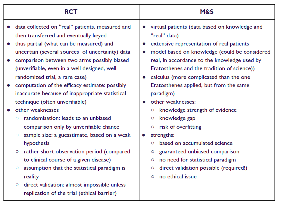 The comparison between RCT and M&S as a tool to measure and predict clinical efficacy of a new therapy is summarized in Table 5.