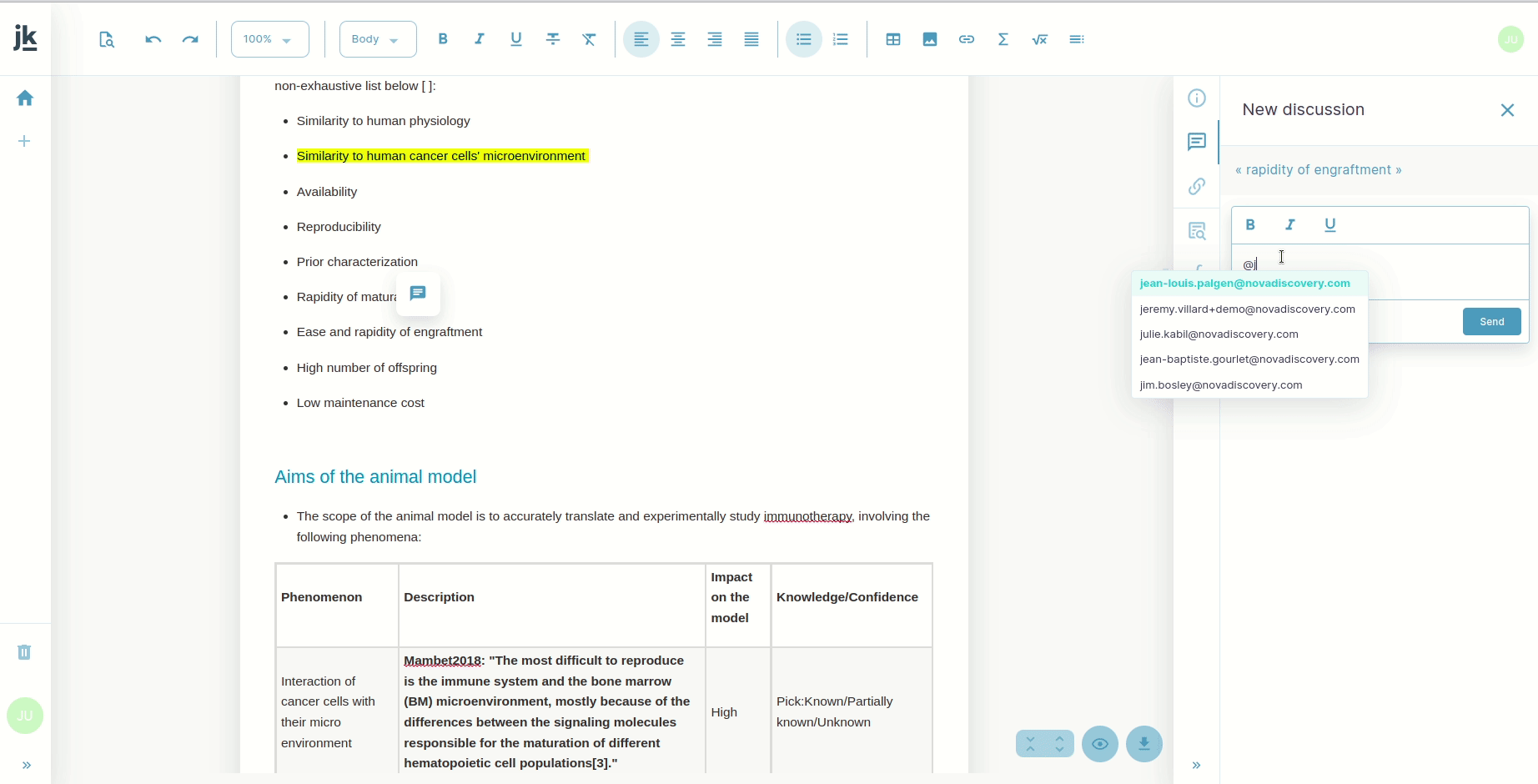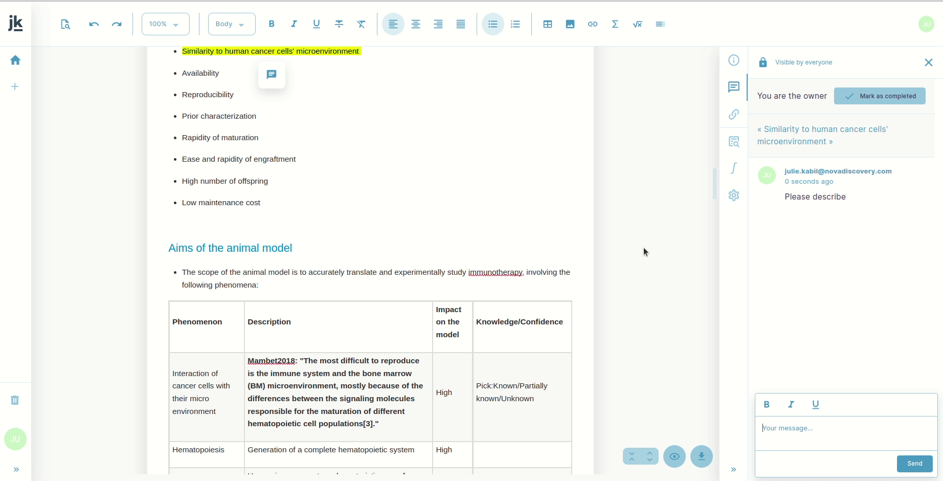 To comment on a specific part of the document, start by highlighting the content you would like to comment on. Then, simply click on the text bubble that appears right above: the Messages panel opens, allowing you type your comment.