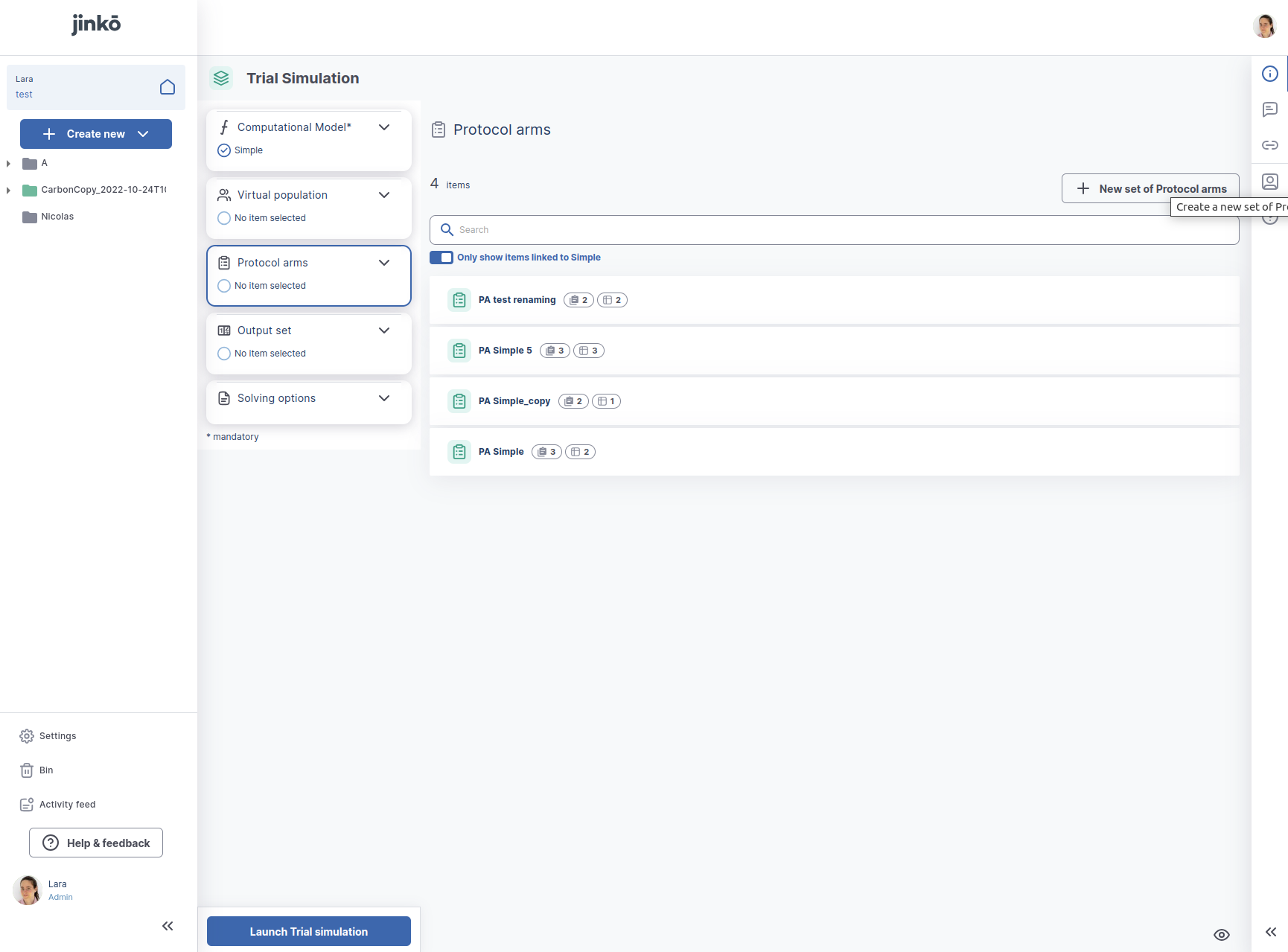 To start creating Protocol arms, you first need to create a trial simulation, which will be attached to a CM, and go to the Protocol arms section of the trial: