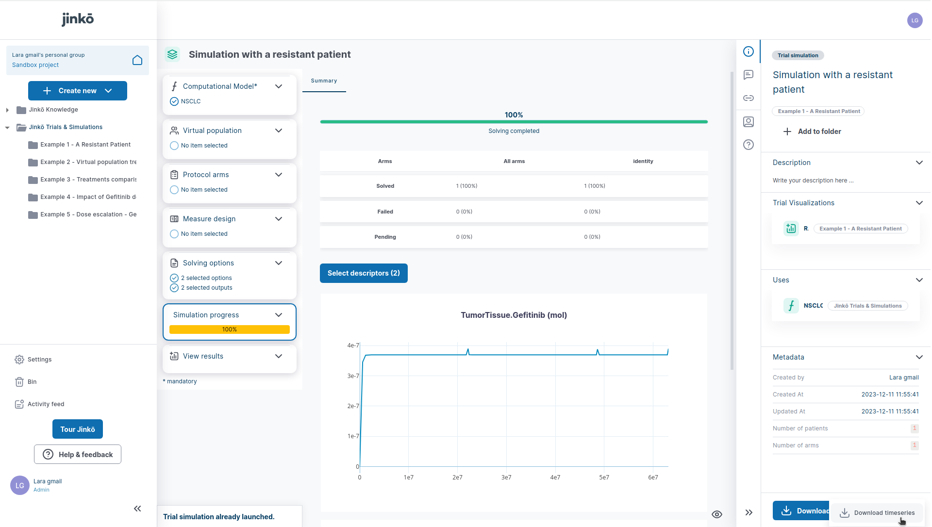 After running a trial, you have the option to download the simulations results in a CSV format. The value of each scalar result associated to a patient, for each arm, will be outputted in this file.