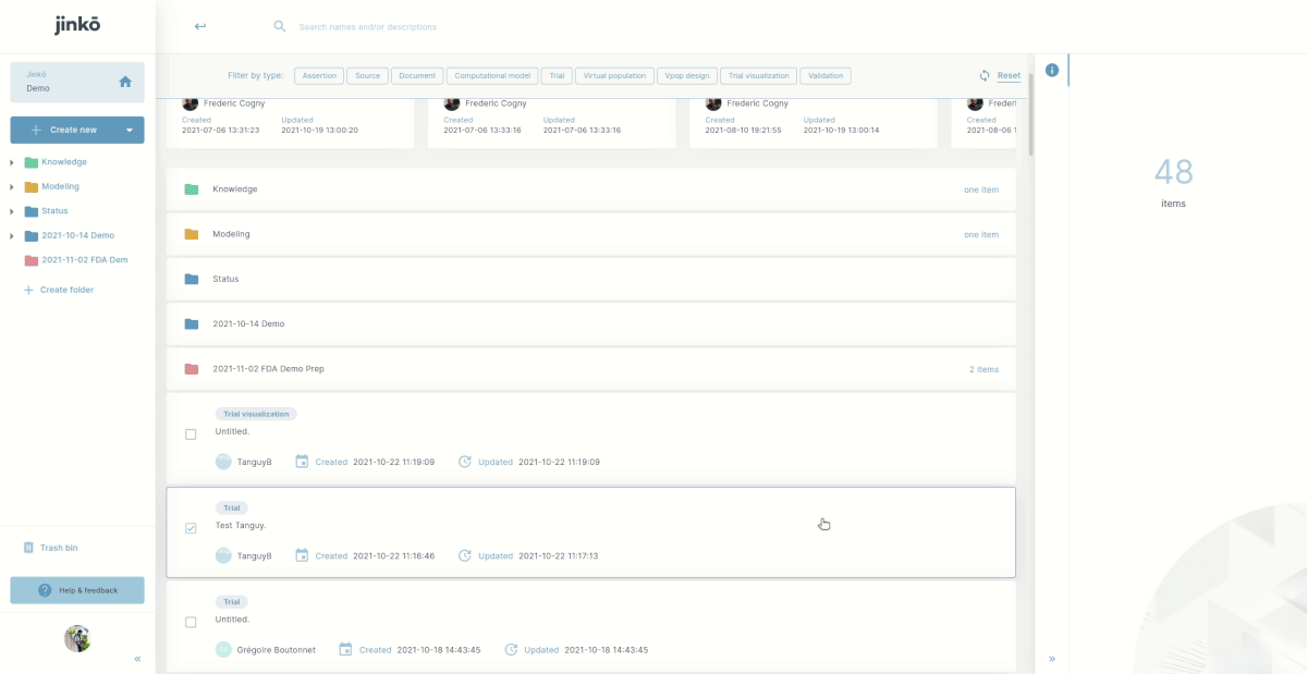 - 'Linked to' displays all the project items to which a particular document is linked to (e.g. if you are editing a Trial, the Virtual Population and Computational Model used for the trial will be referenced). By clicking on any linked item, you will get more information about it and will have the option to open it should you want to see this particular item in detail.